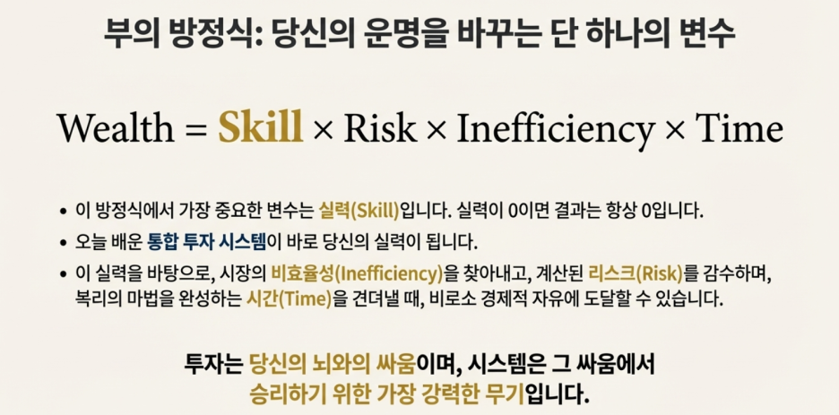 지금까지 배운 모든 개념은 하나의 공식으로 통합될 수 있습니다. 바로 '부의 방정식'입니다. 이 공식은 투자를 통해 어떻게 부가 만들어지는지에 대한 핵심 원리를 담고 있습니다.