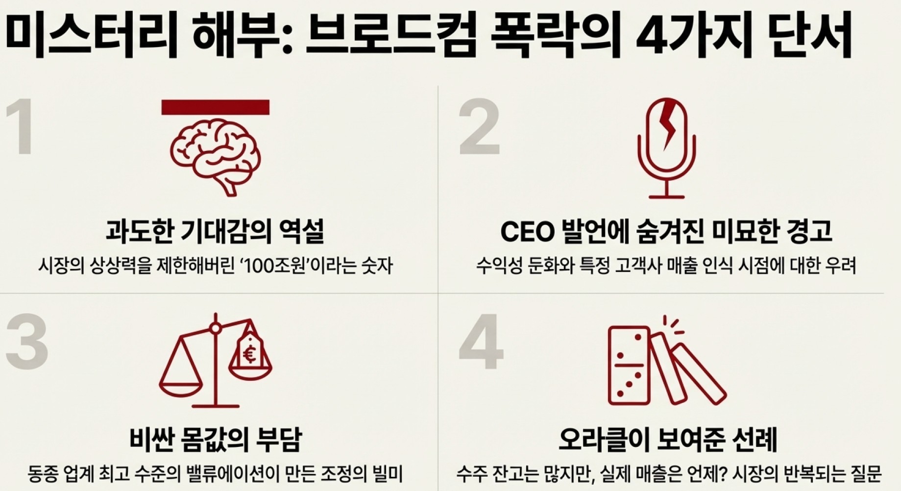 결국 브로드컴의 주가 하락은 단순한 실적 악화가 아닌, 과도한 기대감, 높은 밸류에이션 부담, 그리고 수익성에 대한 현실적 의문이 복합적으로 작용한 시장의 경고 메시지였습니다.