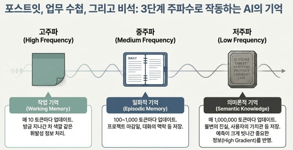 - AI 구현: 저주파 모듈 - 수백만 토큰 단위로 매우 드물게 업데이트하며 세상의 법칙 저장