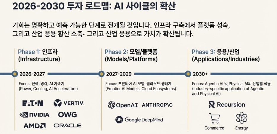 본 보고서에서 분석했듯이, AI 사이클은 끝나지 않았습니다. 오히려 '꿈'과 '기대감'의 1막을 지나, 실질적인 수익성과 가치 창출을 증명해야 하는 '추론의 시대', 즉 2막으로 진입하고 있습니다. 이 거대한 패러다임 전환 속에서 전력 인프라와 차세대 반도체가 성장의 핵심 동력으로 부상했으며, 인간의 고유한 '안목'이 새로운 가치의 원천이 되고 있습니다.