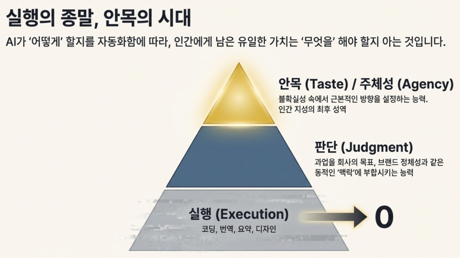 결국 기술이 발전할수록 역설적으로 가장 인간적인 '안목'과 '판단력'이 개인과 기업의 생존을 가르는 핵심 경쟁력이 되고 있습니다. AI라는 무한한 실행 도구를 활용해 어떤 가치를 창조할 것인지를 결정하는 능력, 이것이 바로 새로운 시대의 리더십입니다.
