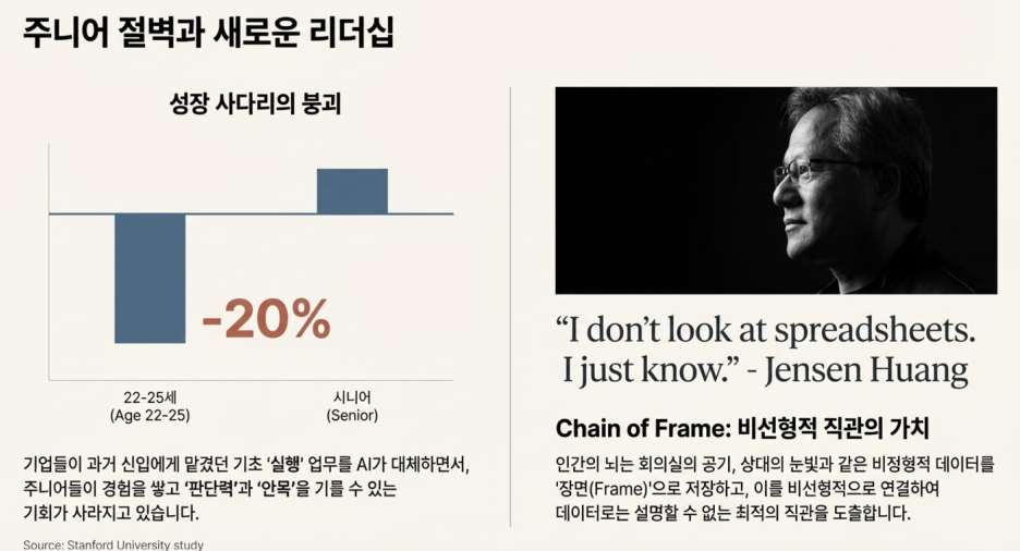 그렇다면 이 시대에 인간 지성의 최후 성역은 무엇일까요? 엔비디아 젠슨 황의 "나는 스프레드시트를 보지 않는다. 나는 그냥 안다(I just know)"라는 직관적 발언에서 그 단서를 찾을 수 있습니다. 이는 뇌과학의 'Chain of Frame' 개념으로 설명 가능합니다.