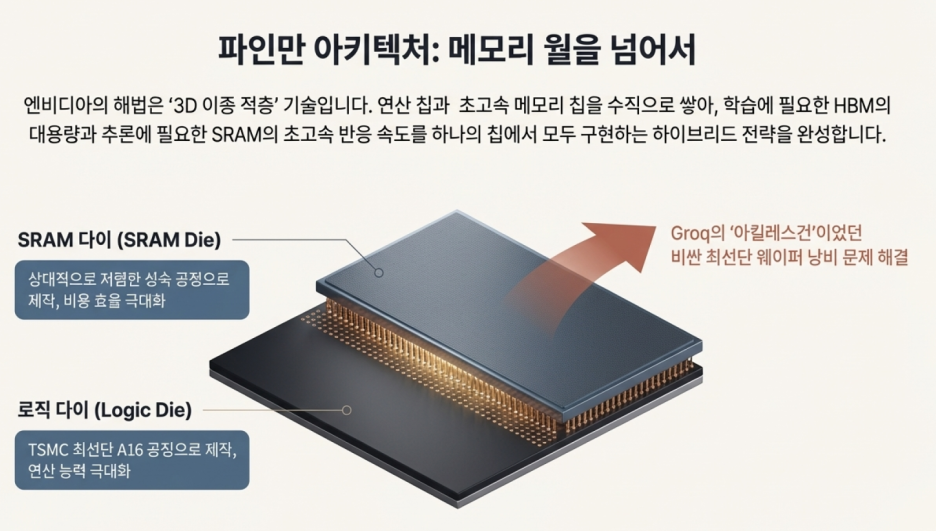 엔비디아의 해결책은 차세대 '파인만(Feynman)' 아키텍처에서 제시됩니다. 핵심은 '3D 이종 적층(Heterogeneous Integration)' 기술입니다. 연산을 담당하는 GPU 칩 위에, Groq의 기술이 적용된 초고속 메모리(SRAM) 칩을 빌딩처럼 수직으로 쌓아 올리는 것입니다.