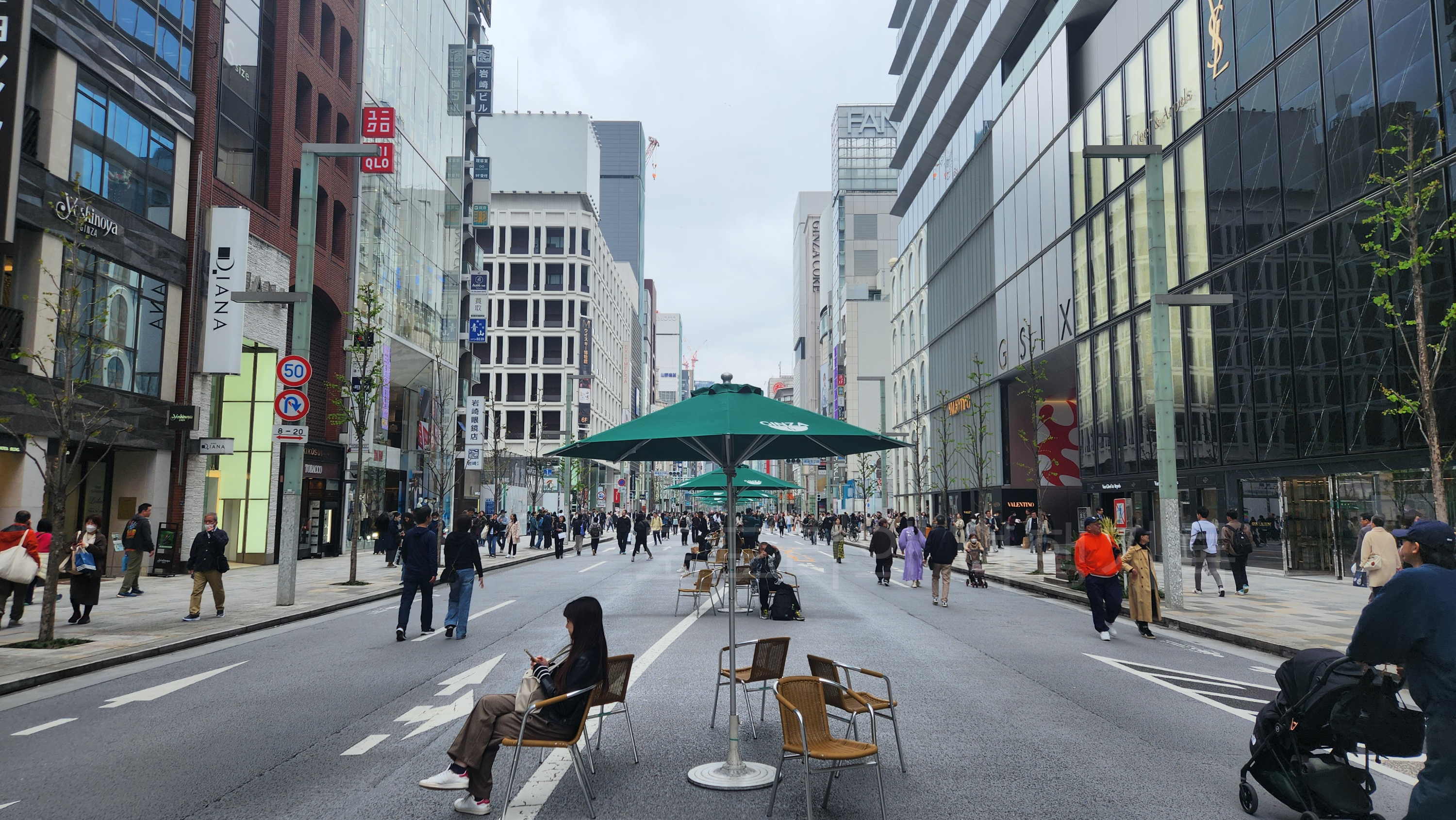 (긴자는 주말에 차 없는 거리가 된다고 합니다. 정말 좋은 정책이라는 생각이 들었습니다. 수많은 사람들이 빌딩숲을 거닐며 쇼핑도 하고 잠시 쉬며 대화도 하고, 제가 거주하고 있는 신촌도 차없는 거리를 간혹 하는데 버스킹도 하고 다양한 공연도 하는 걸 보면 정말 좋다는 생각을 했습니다.)