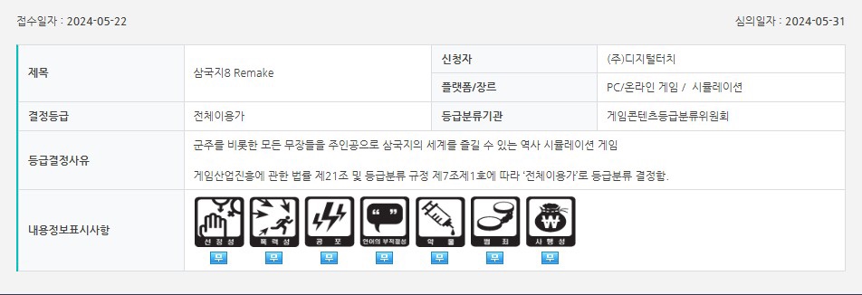 • 삼국지 8의 리메이크는 전체 이용가 등급을 받음.