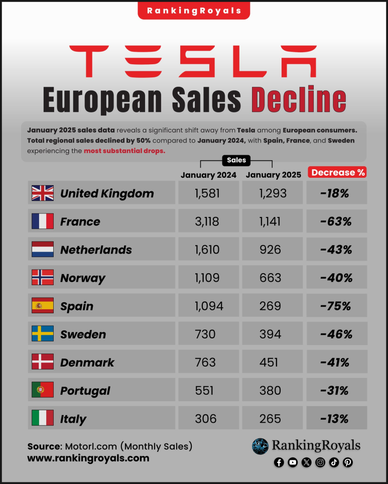 수치로 테슬라 유럽 판매량 감소율을 보면