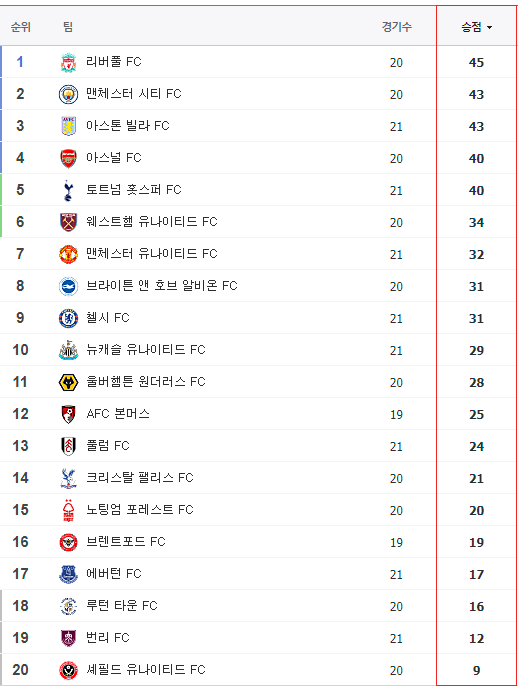먼저 우승권에는 선두 리버풀(승점 45)을 필두로 2위 맨체스터 시티, 3위 아스톤 빌라(이상 승점 43), 4위 아스널, 5위 토트넘 훗스퍼(이상 승점 40) 순으로 선두권을 만들었고, 강등권에는 최하위 셰필드 유나이티드(승점 9), 19위 번리(승점 12), 18위 루턴 타운(승점 16), 17위 에버튼(승점 17), 16위 브렌트포드(승점 19)가 있습니다.