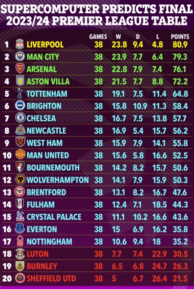 에버튼은 승점 삭감을 받았는데 추가로 승점 삭감 조치를 받을 수 있다는 소리가 들리고 있습니다. 이런 상황에 영국 '더 선'이 '베팅 엑스퍼트'가 보유한 슈퍼컴퓨터 'BETSiE'가 예측한 결과를 바탕으로 올 시즌 리그 최종 순위를 전망했습니다.