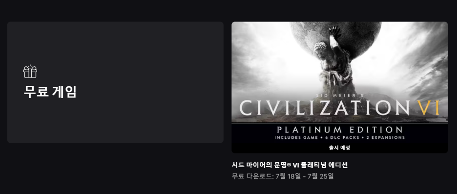 안녕하세요 토드리입니다.다음주 금요일부터 에픽게임즈에서 문명을 무료배포 합니다.약 8만원 상당의 게임이니 다들 무료로 즐겨보세요.🎮 문명6 플래티넘 에디션 소개전 세계적으로 사랑받는 전략 시뮬레이션 게임, 시드 마이어의 문명 VI(Civilization VI)! 그 중에서도 플래티넘 에디션은 문명6을 제대로 즐기고 싶은 유저들에게 딱 맞는 구성입니다.🧭 어떤 게임인가요?턴제 전략 게임으로, 플레이어는 하나의 문명을 선택해 석기 시대부터 미래 시대까지 이끌어갑니다.외교, 전쟁, 과학, 문화 등 다양한 방식으로 세계 패권을 차지하는 것이 목표!“한 턴만 더…”를 외치게 만드는 중독성으로 ‘악마의 게임’이라 불리기도 해요.💎 플래티넘 에디션 구성문명6 본편2개의 대형 확장팩🌅 흥망성쇠(Rise and ..